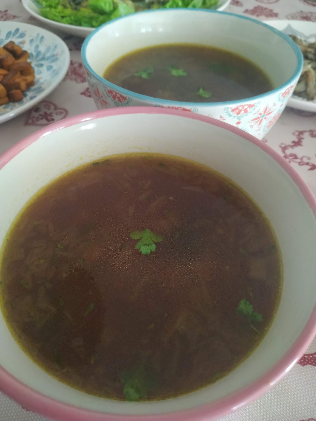 Por otra parte, Meri a veces me dice que se ha hecho una sopa de cebolla y tomillo...así que lo que hice fue juntar la receta de mi abuelo y la de Meri y añadir algunas cosas de mi cosecha (cúrcuma, pimentón, pimienta negra, tamari...) y nada, aquí tenéis el resultado. ¡Ah! Quité el pan, pero si os apetece le podéis poner pan seco o incluso picatostes.
